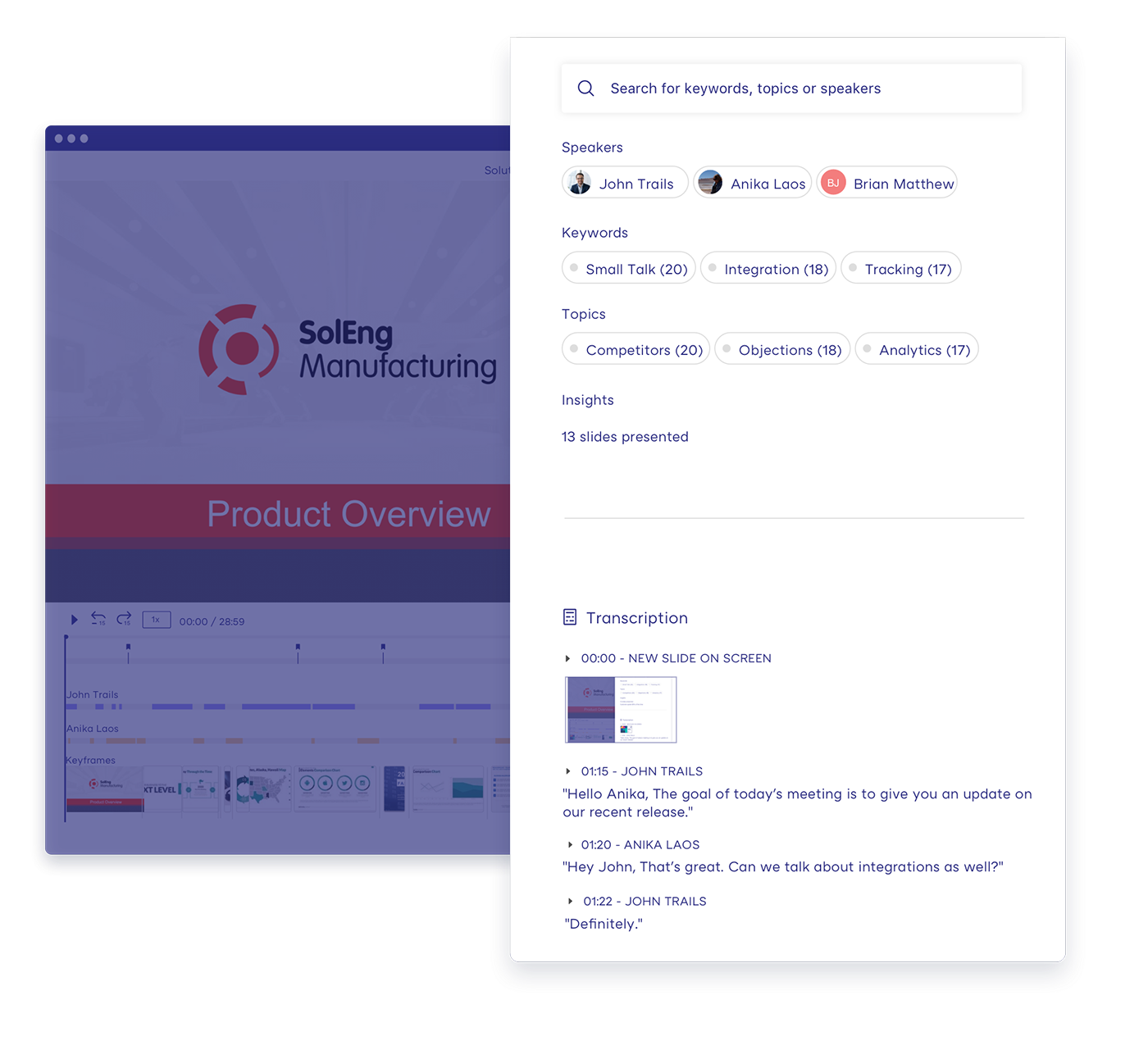 Never let sellers lose time again transcribing and listening back to calls. Speed up your sales process, and pursue leads more efficiently than ever before. Meeting details can be logged to your CRM – allowing you to get a holistic view of all customer interactions in your platform of choice.